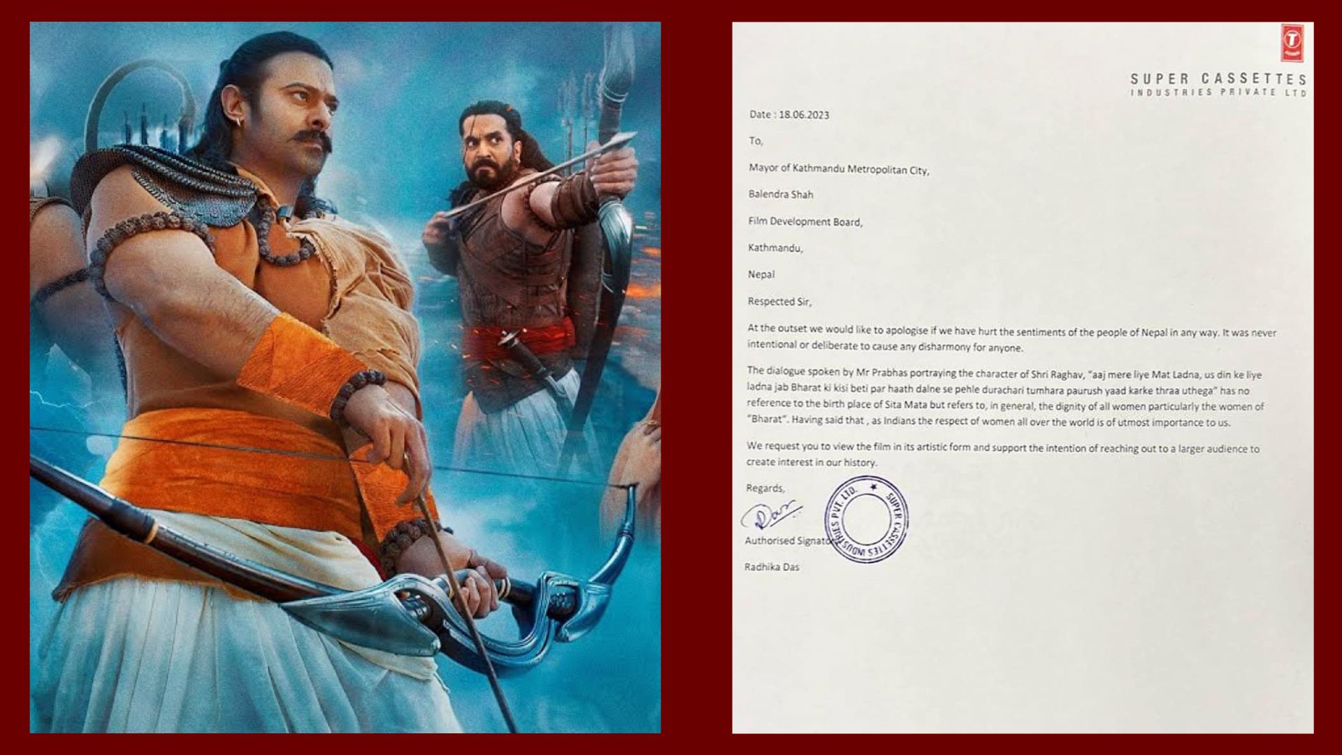 काठमाडौं । ‘आदिपुरुष’ को निर्माण कम्पनी सुपर क्यासेट्सले इमेल मार्फत फिल्ममा समावेश संवादले परेको प्रभावप्रति माफी मागेको छ ।