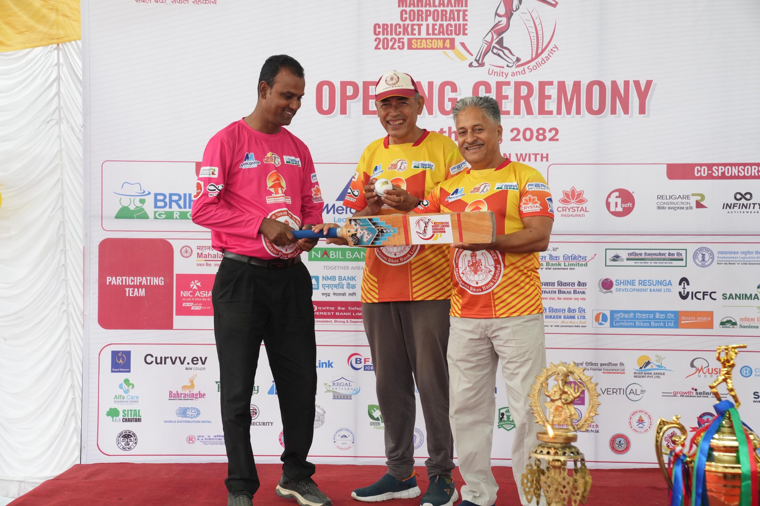 बैंकले बुधबार आयोजना गरेको समुद्घाटन कार्यक्रममा महालक्ष्मी विकास बैंकको संचालक समितिका अध्यक्षले म्याच अफिसियलहरुलाई बल र ब्याट हस्तान्तरण गरी लिगको आरम्भ गरेका थिए ।