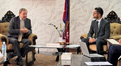 काठमाडौं । शिक्षा, विज्ञान तथा प्रविधिमन्त्री सस्मित पोखरेल र नेपालका लागि संयुक्त अधिराज्य (बेलायत) का राजदूत रब फेनबीच बुधबार सिंहदरबारमा शिष्टाचार भेटवार्ता भएको छ । मन्त्रालयमा भएको उक्त भेटवार्तामा दुई